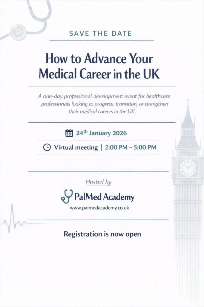 This recorded webinar by PalMed Academy provides a comprehensive guide for doctors and healthcare professionals who are planning to start, progress, and succeed in a medical career in the United Kingdom.